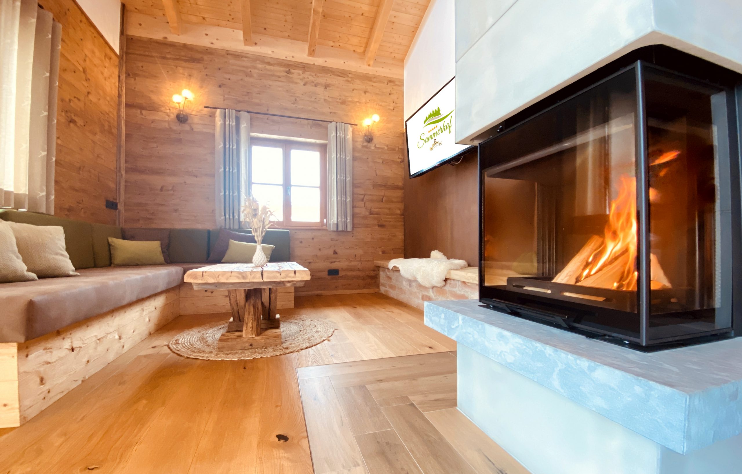 Gibt es etwas Entspannteres als am Kamin zu sitzen und den Blick über verschneite Berggipfel schwelgen zu lassen? Absolute Stille erfüllt den Raum – und wird vom Knistern des Feuers umrahmt. Diese luxuriöse Ruhe-Erfahrung bildet das Herz der zwei Senhoog Chalets in Leogang.