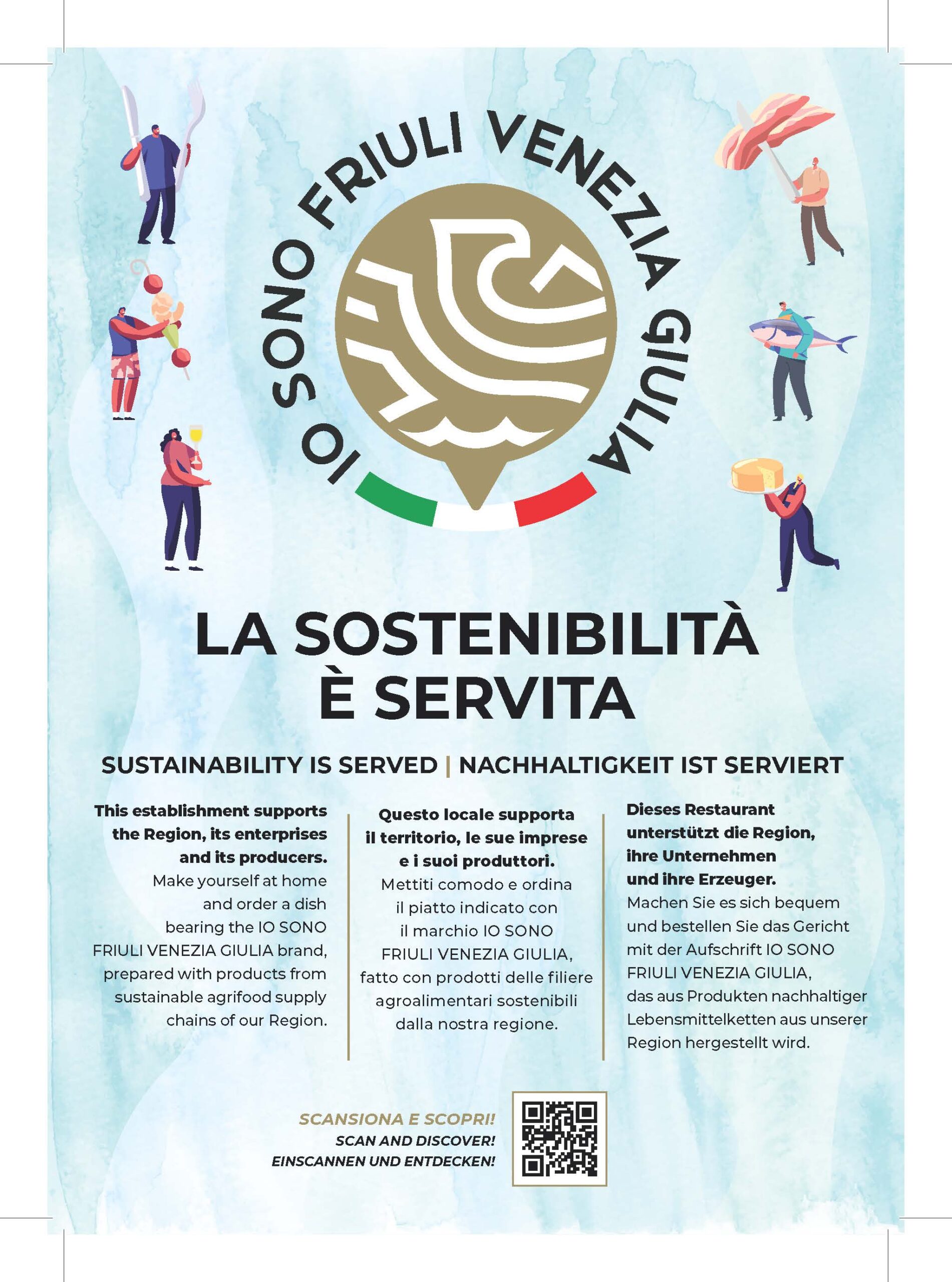 Die Initiative wird in den verschiedenen Betrieben durch Plakate, auf den Speisekarten, auf dem Fensteraufkleber Agrifood FVG oder dem Aufkleber Io Sono Friuli Venezia Giulia erkennbar sein.