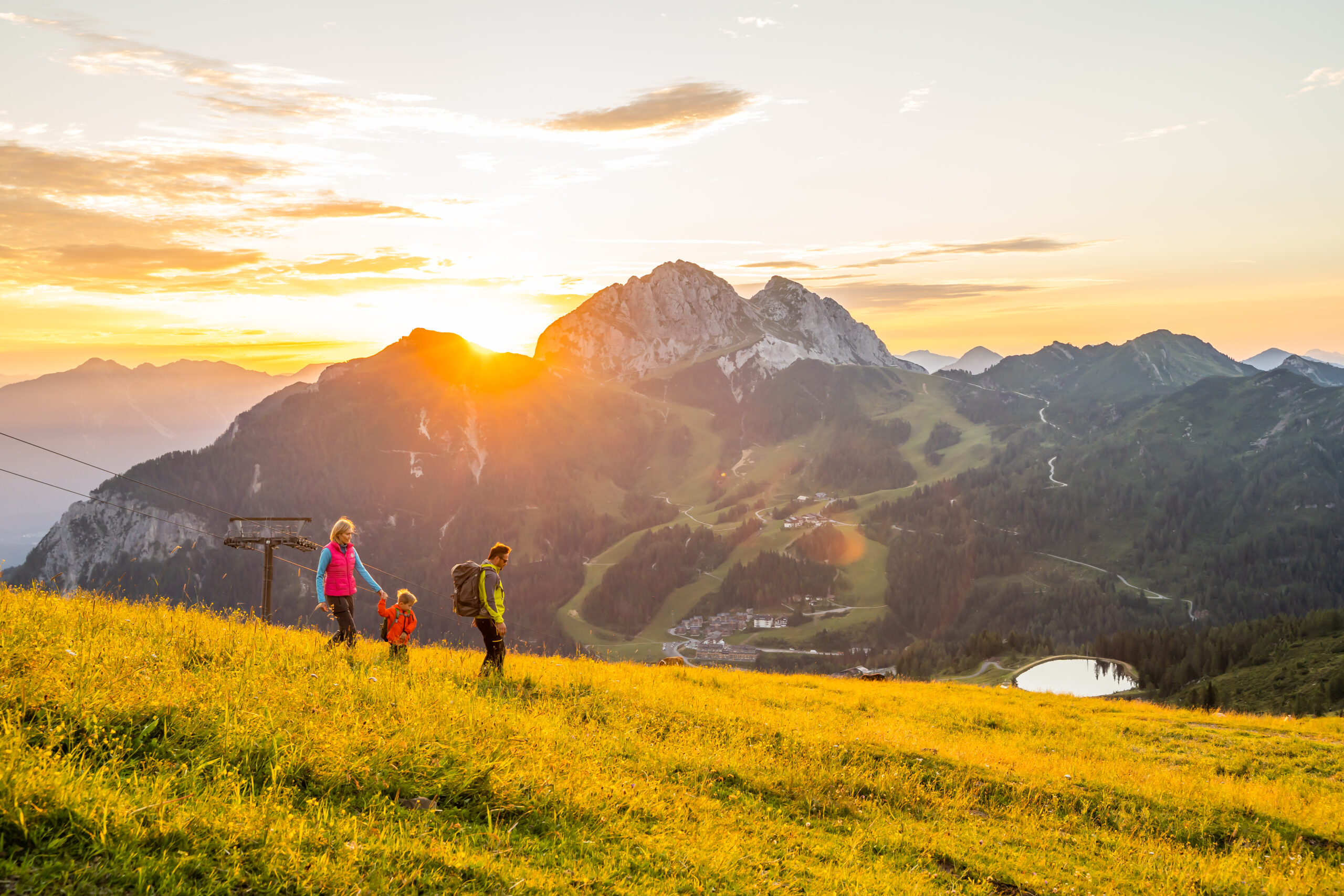 Praktisch: Panoramatafeln und Viscope-Fernrohre auf der Panoramaterrasse „Skyplate“ zeigen den Namen des Berges an, der anvisiert wird. Im Anschluss an den Sonnenaufgang bewahren sich AbenteurerInnen ihre Glücksgefühle noch länger, indem sie den spektakulären Klettersteig am Däumling bezwingen. Mit drei Seilbrücken und einer circa 40 Meter langen Nepalbrücke bedarf es hier Schwindelfreiheit und Gleichgewicht. Dafür werden BergsteigerInnen mit einem weiteren unvergesslichen Panorama belohnt. Am Ende lädt die Watschiger Alm noch dazu ein, die frühmorgendliche Tour gemütlich ausklingen zu lassen.