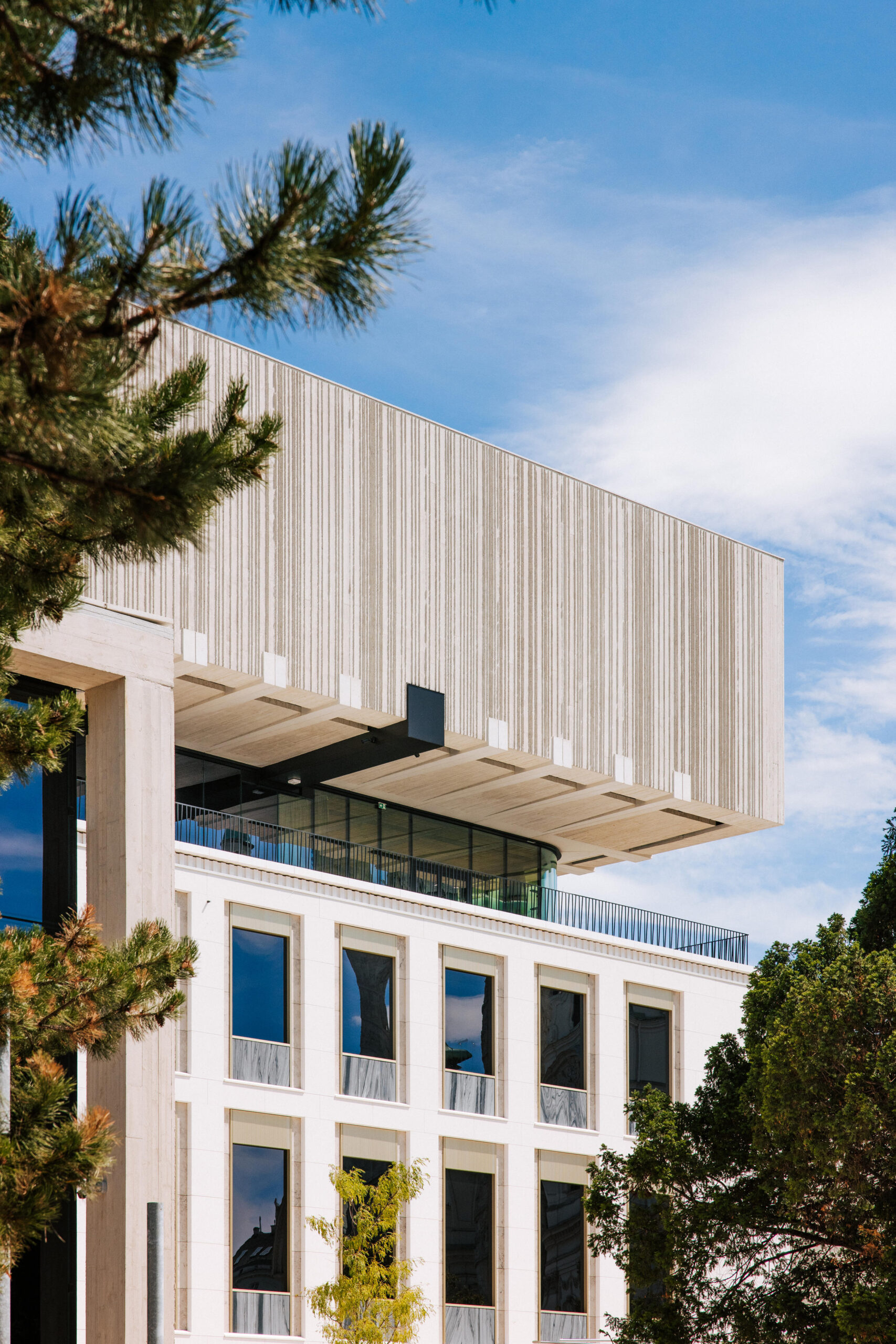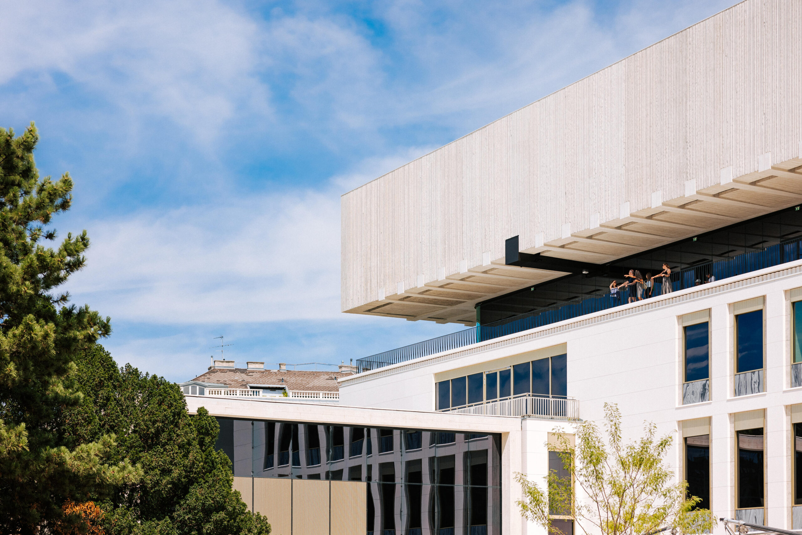 Zwischen Alt- und Neubau ist ein Freiraum entstanden, der als Terrassengeschoß verwendet wird. Es bietet spektakuläre Ausblicke auf den Karlsplatz und die Umgebung. Auf dieser Etage sind ein Café, ein Veranstaltungszentrum und Vermittlungsateliers untergebracht. Der Eingangsbereich wurde um einen Glaspavillon ergänzt, der die Besucher:innen wie eine ausgestreckte Hand empfangen möchte.